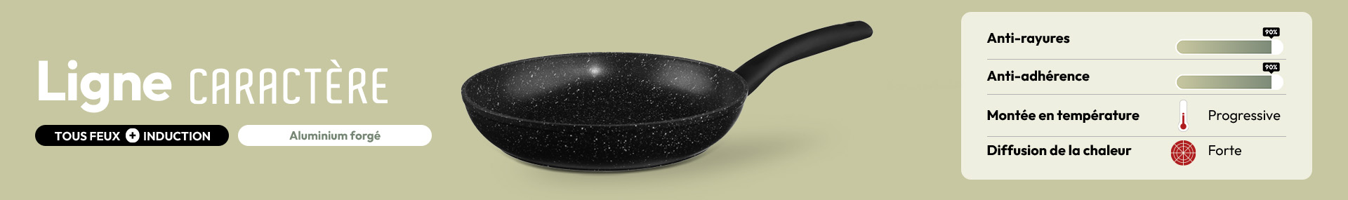 La collection Caractère comprend des poêles, des casseroles, des faitouts, des sauteuses, des grills, des crêpières et un wok.