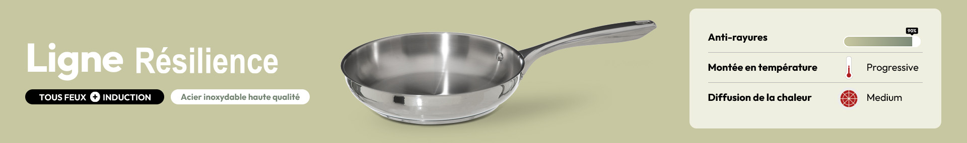 Résilience, une gamme robuste en acier inoxydable, idéale pour une cuisson précise et durable. Sa conception sans revêtement assure des plats sains et savoureux.
