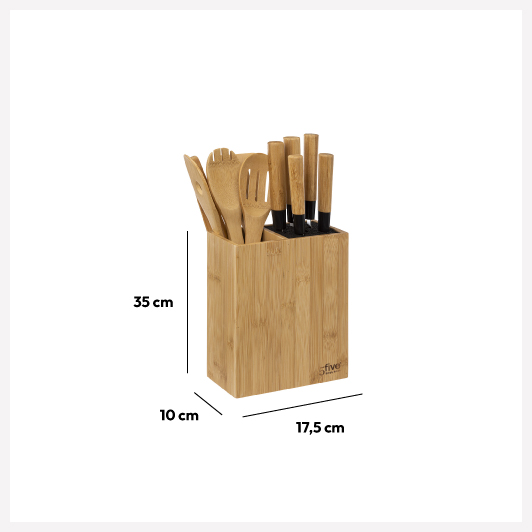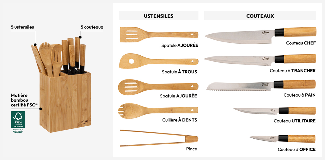 Bloc 5 couteaux & 5 ustensiles, manche bambou