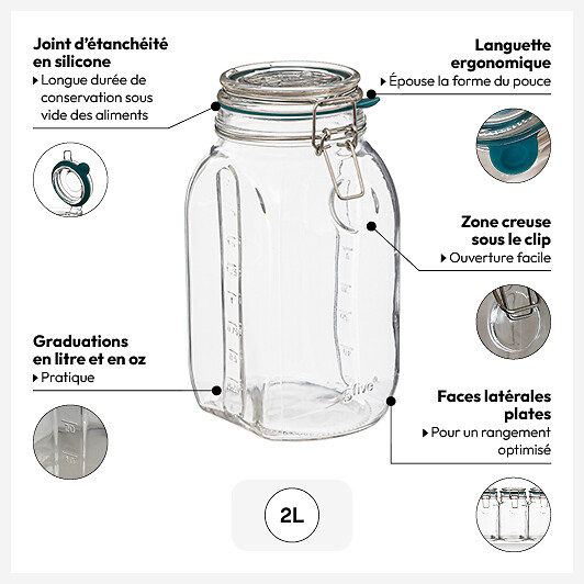 Munis de joints en silicone, ces bocaux apportent herméticité et praticité. Préparez, remplissez, conservez et rangez en toute simplicité.