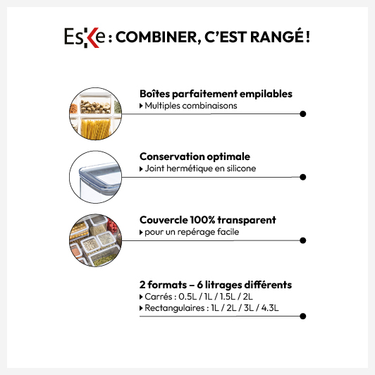 Boîtes de rangement alimentaire, à double visibilité et parfaitement empilable, pour un rangement optimal dans un placard, dans un tiroir ou même sur votre plan de travail.