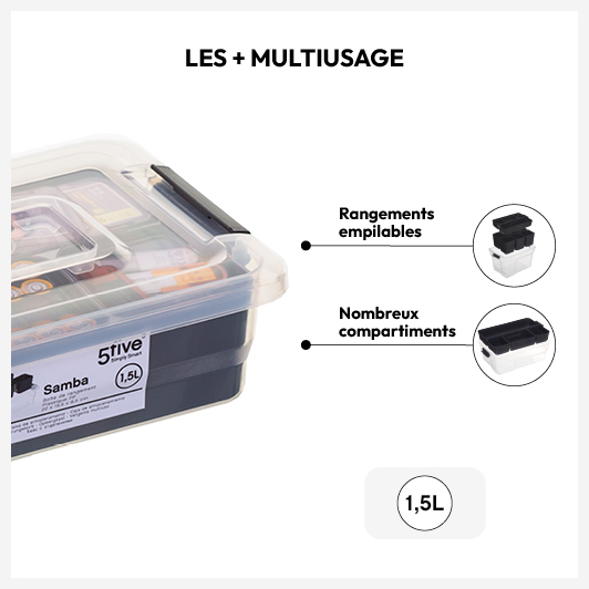 Boîtes de rangement clipsables et empilables, avec de nombreux compartiments, pour ranger toutes les affaires de la maison.