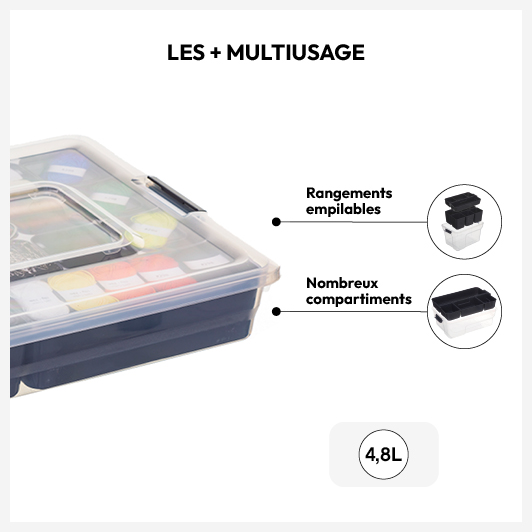 Boîtes de rangement clipsables et empilables, avec de nombreux compartiments, pour ranger toutes les affaires de la maison.