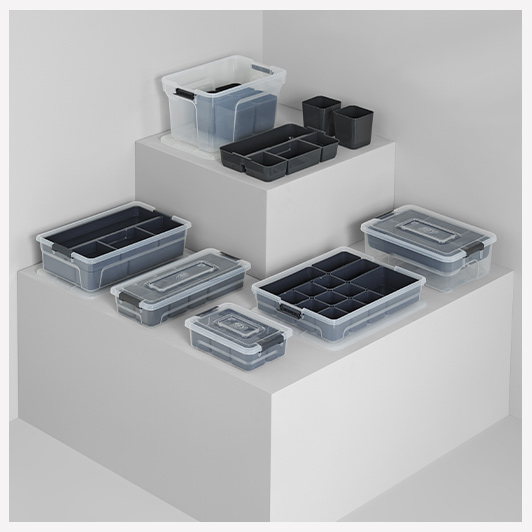 Boîtes de rangement clipsables et empilables, avec de nombreux compartiments, pour ranger toutes les affaires de la maison.