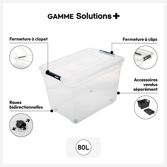 Boîtes de rangement à roulettes avec deux systèmes d'ouverture et personnalisables avec des compartiments.