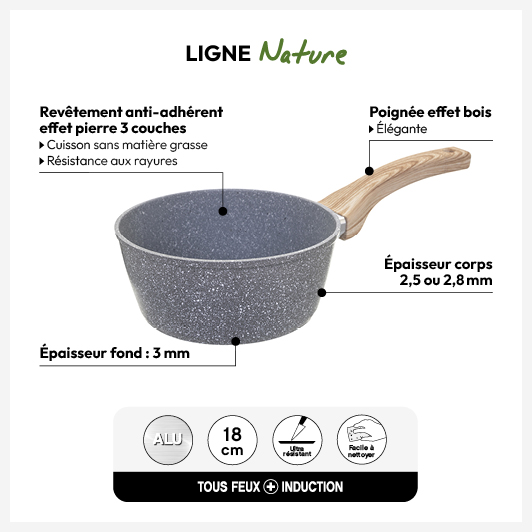 Nature, une gamme fonctionnelle alliant résistance et élégance. Le revêtement antiadhésif durable permet une cuisson homogène, sans accroche et avec facilité.