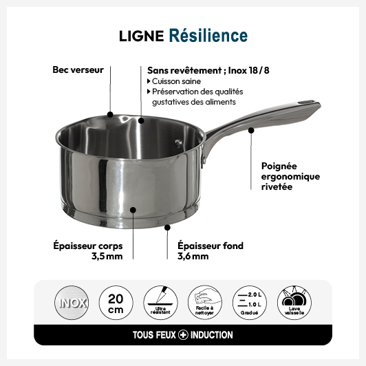 Résilience, une gamme robuste en acier inoxydable, idéale pour une cuisson précise et durable. Sa conception sans revêtement assure des plats sains et savoureux.