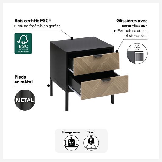 Chevet 2 tiroirs, Effet pin naturel et noir