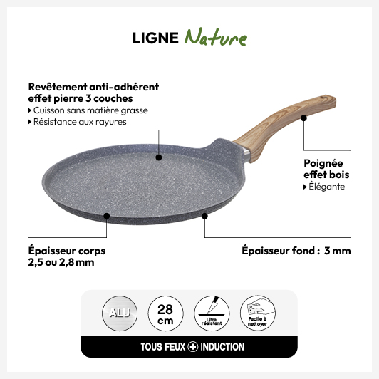 Nature, une gamme fonctionnelle alliant résistance et élégance. Le revêtement antiadhésif durable permet une cuisson homogène, sans accroche et avec facilité.