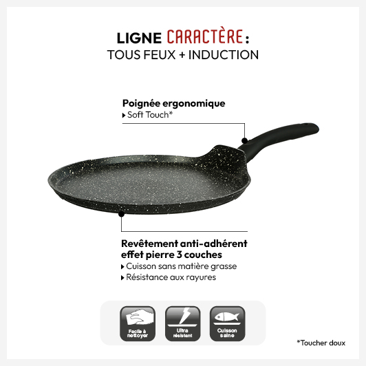 Caractère, pour une cuisine élégante et performante. Son revêtement antiadhésif effet pierre garantit des cuissons homogènes sans matière grasse.