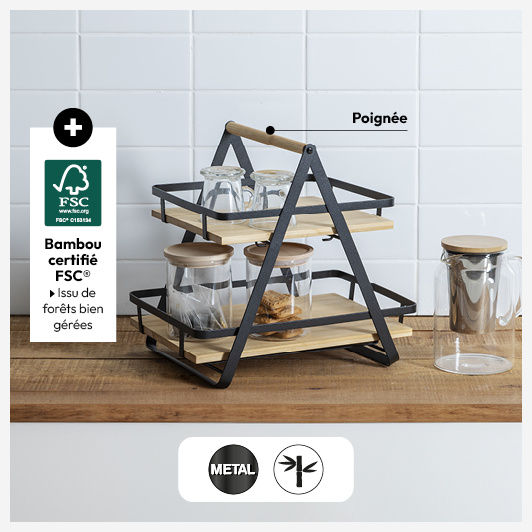 Optimisez votre espace avec nos étagères de cuisine en bambou certifié FSC et structure en métal, alliant esthétisme et fonctionnalité pour un rangement design et facile à intégrer dans toutes les cuisines.