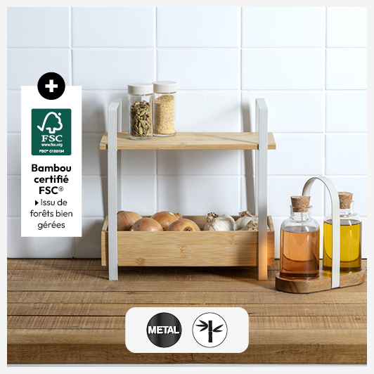 Optimisez votre espace avec nos étagères de cuisine en bambou certifié FSC et structure en métal, alliant esthétisme et fonctionnalité pour un rangement design et facile à intégrer dans toutes les cuisines.