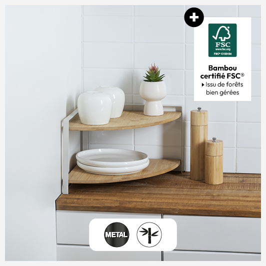Optimisez votre espace avec nos étagères de cuisine en bambou certifié FSC et structure en métal, alliant esthétisme et fonctionnalité pour un rangement design et facile à intégrer dans toutes les cuisines.
