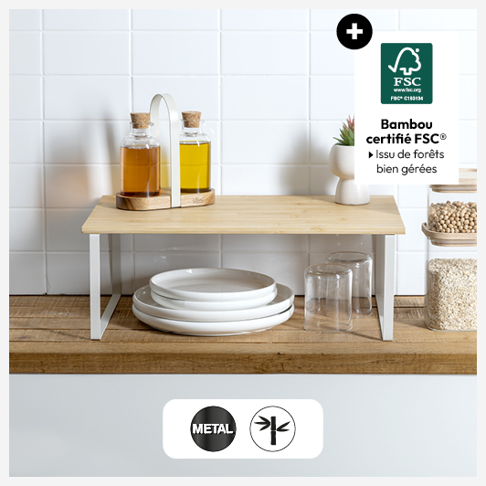 Optimisez votre espace avec nos étagères de cuisine en bambou certifié FSC et structure en métal, alliant esthétisme et fonctionnalité pour un rangement design et facile à intégrer dans toutes les cuisines.