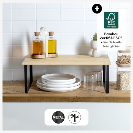 Optimisez votre espace avec nos étagères de cuisine en bambou certifié FSC et structure en métal, alliant esthétisme et fonctionnalité pour un rangement design et facile à intégrer dans toutes les cuisines.