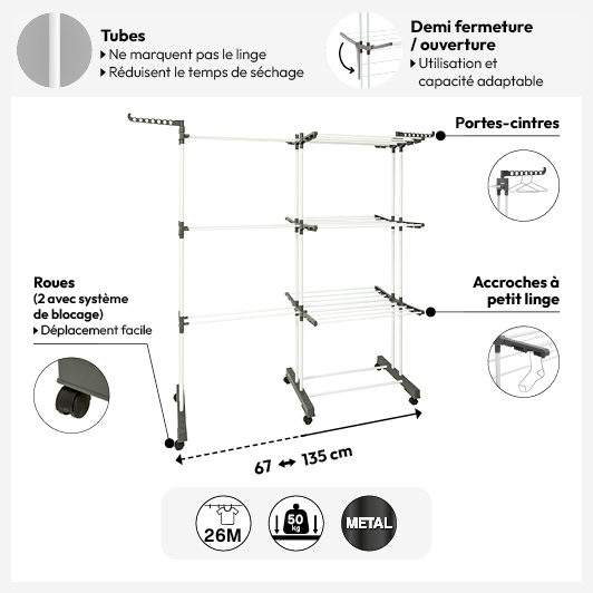 Étendoir à linge extensible et modulable roues 26m