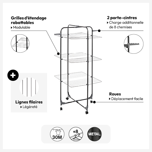 La gamme d'étendoirs spécialement conçus pour optimiser la place dans votre habitation, tout en offrant une grande capacité d'étendage de linge.