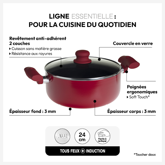 Essentielle, des ustensiles indispensables au quotidien. Légers, rapides à chauffer, et dotés d’un revêtement antiadhérent pour une cuisson sans effort.