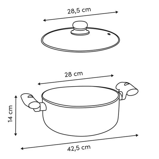 | Dimensions des éléments | Longueur de la poignée : 6,5 cm Diamètre de la base : 21 cm Diamètre du corps : 28,3 cm Épaisseur du bord central : 2 cm Épaisseur du fond : 2,5 cm |