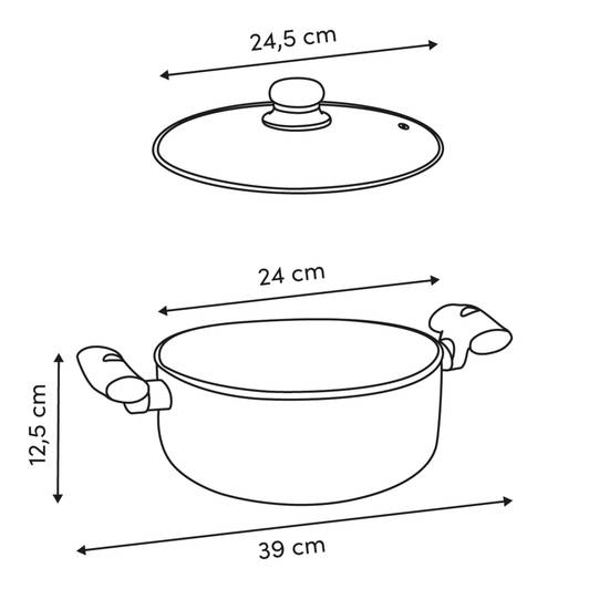 | Dimensions des éléments | Longueur de la poignée : 9,5 cm Diamètre de la base : 18 cm Diamètre du corps : 24,3 cm Épaisseur du bord central : 2 cm Épaisseur du fond : 2,5 cm |