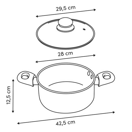 | Dimensions des éléments | Diamètre de la base : 21 cm Diamètre du corps : 28,3 cm Épaisseur du bord central : 0,5 cm Longueur de la poignée : 6,5 cm Épaisseur du fond : 2 cm |