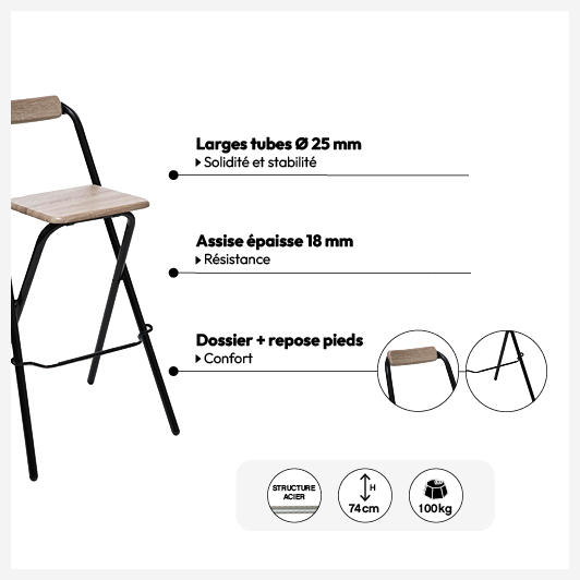 Lot de 4 chaises de bar pliantes, Effet chêne naturel