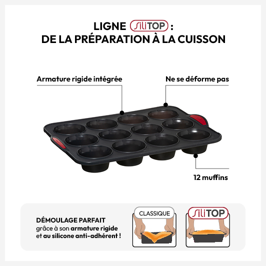 Moule en silicone cerclé avec poignée pour 12 muffins : Extra et pratique. Démoulage facile, nettoyage simple.