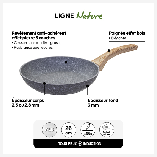 Nature, une gamme fonctionnelle alliant résistance et élégance. Le revêtement antiadhésif durable permet une cuisson homogène, sans accroche et avec facilité.
