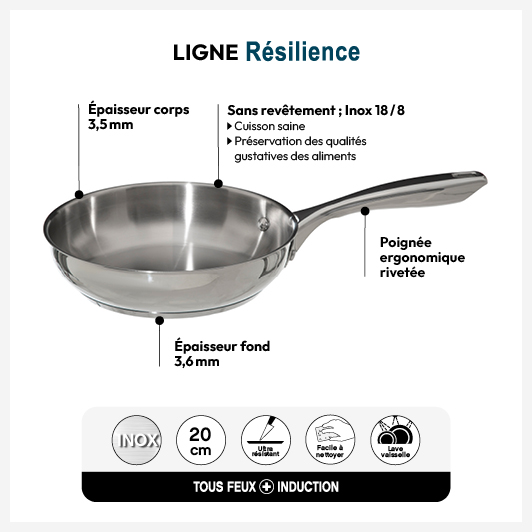Résilience, une gamme robuste en acier inoxydable, idéale pour une cuisson précise et durable. Sa conception sans revêtement assure des plats sains et savoureux.