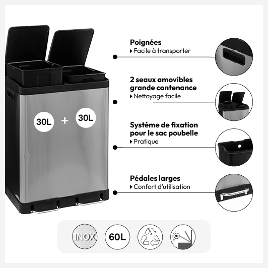 Poubelle de tri sélectif à pédales métal 2x30L, Inox
