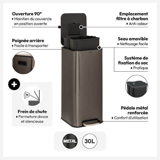La poubelle Delta trouvera sa place chez vous et durera dans le temps, grâce à sa pédale en métal renforcée et son filtre à charbon, pour éviter les mauvaises odeurs.