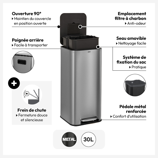La poubelle Delta trouvera sa place chez vous et durera dans le temps, grâce à sa pédale en métal renforcée et son filtre à charbon, pour éviter les mauvaises odeurs.
