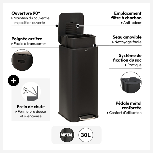 La poubelle Delta trouvera sa place chez vous et durera dans le temps, grâce à sa pédale en métal renforcée et son filtre à charbon, pour éviter les mauvaises odeurs.