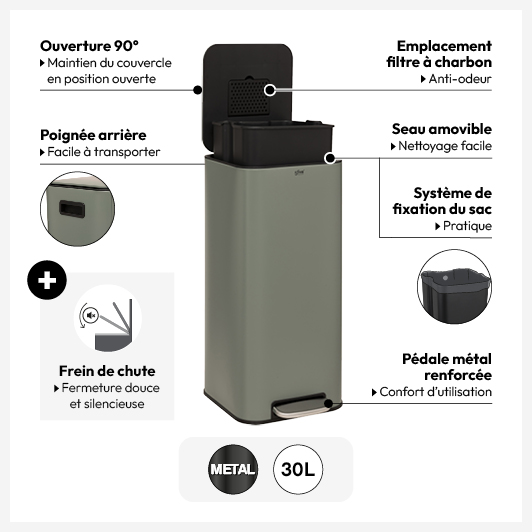 La poubelle Delta trouvera sa place chez vous et durera dans le temps, grâce à sa pédale en métal renforcée et son filtre à charbon, pour éviter les mauvaises odeurs.