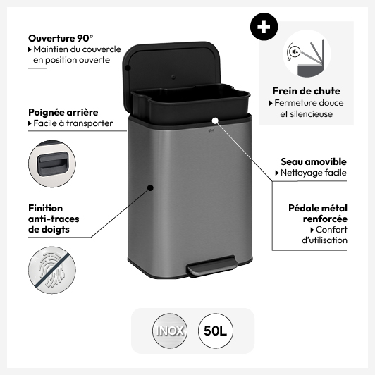 Poubelle métal 50L, Inox finition mat