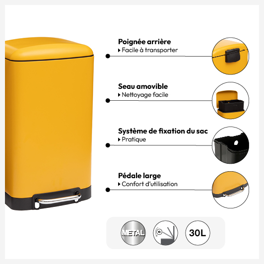 Poubelle rectangulaire à pédale métal 30L, Jaune