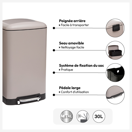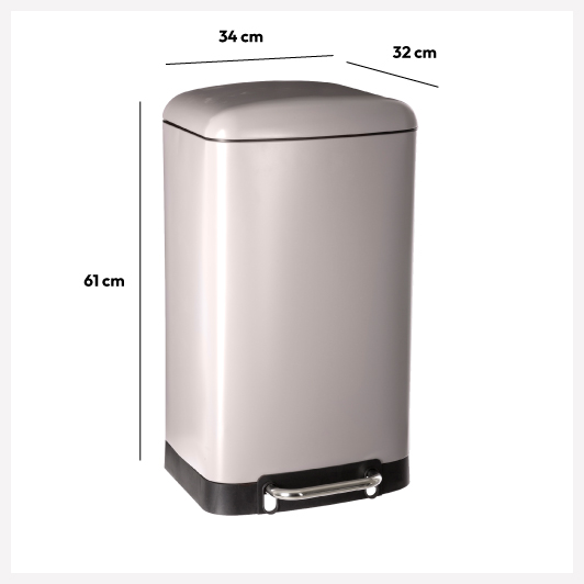 Poubelle rectangulaire à pédale métal 30L, Taupe