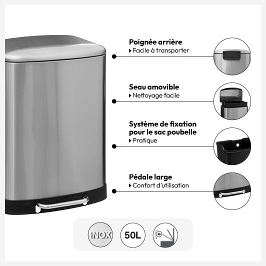 Poubelle rectangulaire à pédale métal 50L, Inox