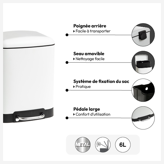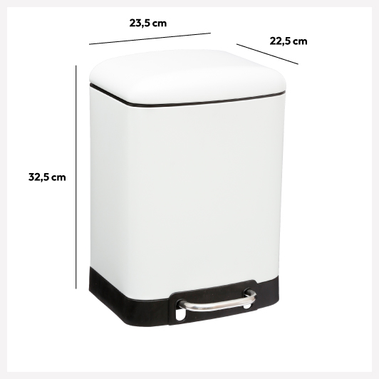 Poubelle rectangulaire à pédale métal 6L, Blanc
