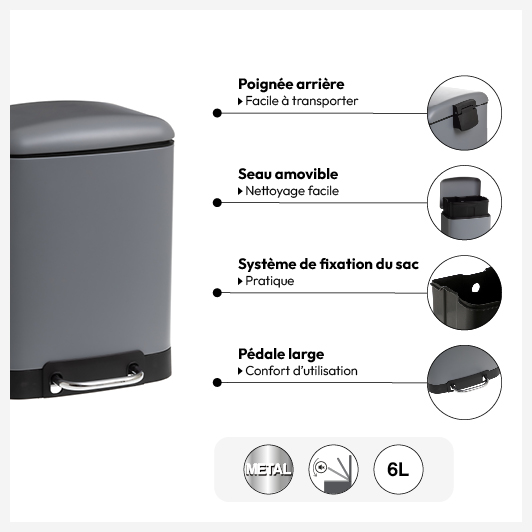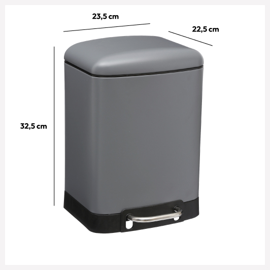 Poubelle rectangulaire à pédale métal 6L, Gris