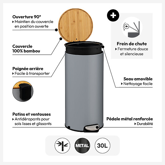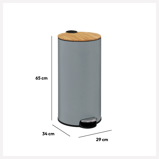 Poubelle ronde avec couvercle bambou 30L, Gris