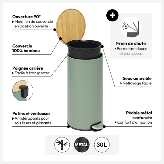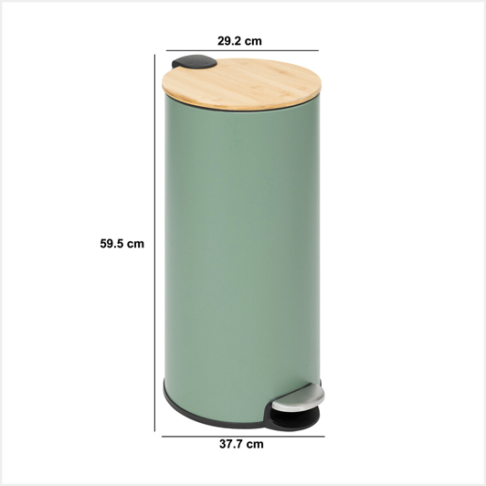 Poubelle ronde Soft Close couvercle bambou 30L, Vert