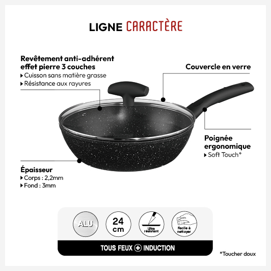 Caractère, pour une cuisine élégante et performante. Son revêtement antiadhésif effet pierre garantit des cuissons homogènes sans matière grasse.