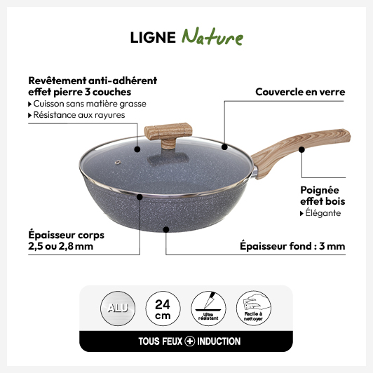 Nature, une gamme fonctionnelle alliant résistance et élégance. Le revêtement antiadhésif durable permet une cuisson homogène, sans accroche et avec facilité.
