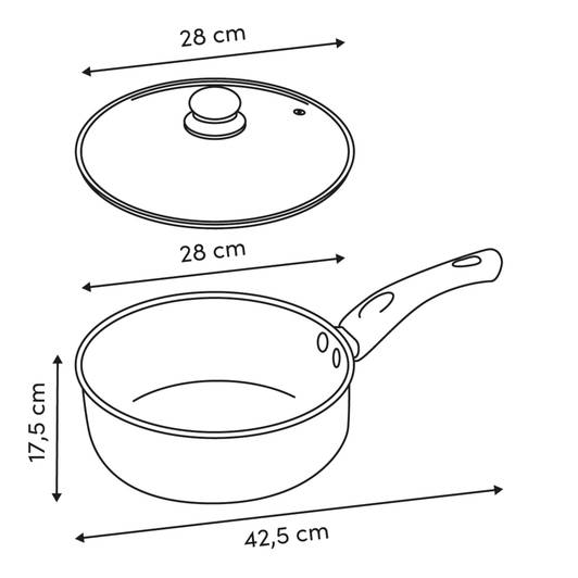 | Dimensions des éléments | Diamètre du corps : 28,0 cm Diamètre de la base : 19,5 cm Épaisseur du bord central : 0,5 cm Épaisseur du fond : 2,0 cm Longueur de la poignée : 20,5 cm |
