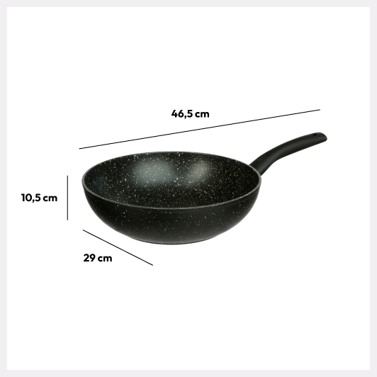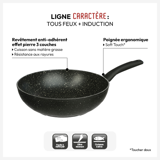 Caractère, pour une cuisine élégante et performante. Son revêtement antiadhésif effet pierre garantit des cuissons homogènes sans matière grasse.